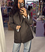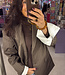 De Elenza Oversized Blaze, Mocha Stripe uit onze eigen Rumah collectie. Deze stijlvolle oversized blazer in warme mocha-tinten met subtiel streepdessin is een echte musthave voor het nieuwe seizoen. De blazer heeft echt een flink oversized fit, de mouwen zijn wat langer en de blazer zelf is ook wat langer. En heb je de leuke details bij de manchetten gezien? Als extra accent is de mouw daar met een witte stof gevoerd, die je af en toe ziet met dragen. Je kunt de mouwen ook omslaan zodat de voering helemaal goed zichtbaar is. Of je nu kiest voor een zakelijke look of een casual-chique outfit — met deze blazer maak je moeiteloos een stijlvolle indruk. We hebben de blazer ook in het donkerbruin op onze webshop staan.