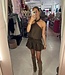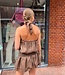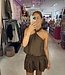 De India Playsuit in bruin is een echte musthave voor zonnige dagen of een feestje. De stof heeft een subtiele glans die het net wat meer uitstraling geeft. Door het haltermodel dat je zelf kunt strikken, bepaal je makkelijk de pasvorm. De bovenkant heeft een licht pofeffect. Bij de taille is die gedrapeerd met elastiek waardoor die mooi aansluit.
