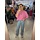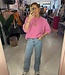De jeans is een mid-waist model dus valt niet heel hoog. Aan de bovenkant sluit het mooi aan en loopt dan wat wijder uit. Je kunt er voor kiezen om met de twee linten een strik te maken of het lint nog eens om de pijp heen te doen zodat het wat meer gaat poffen.